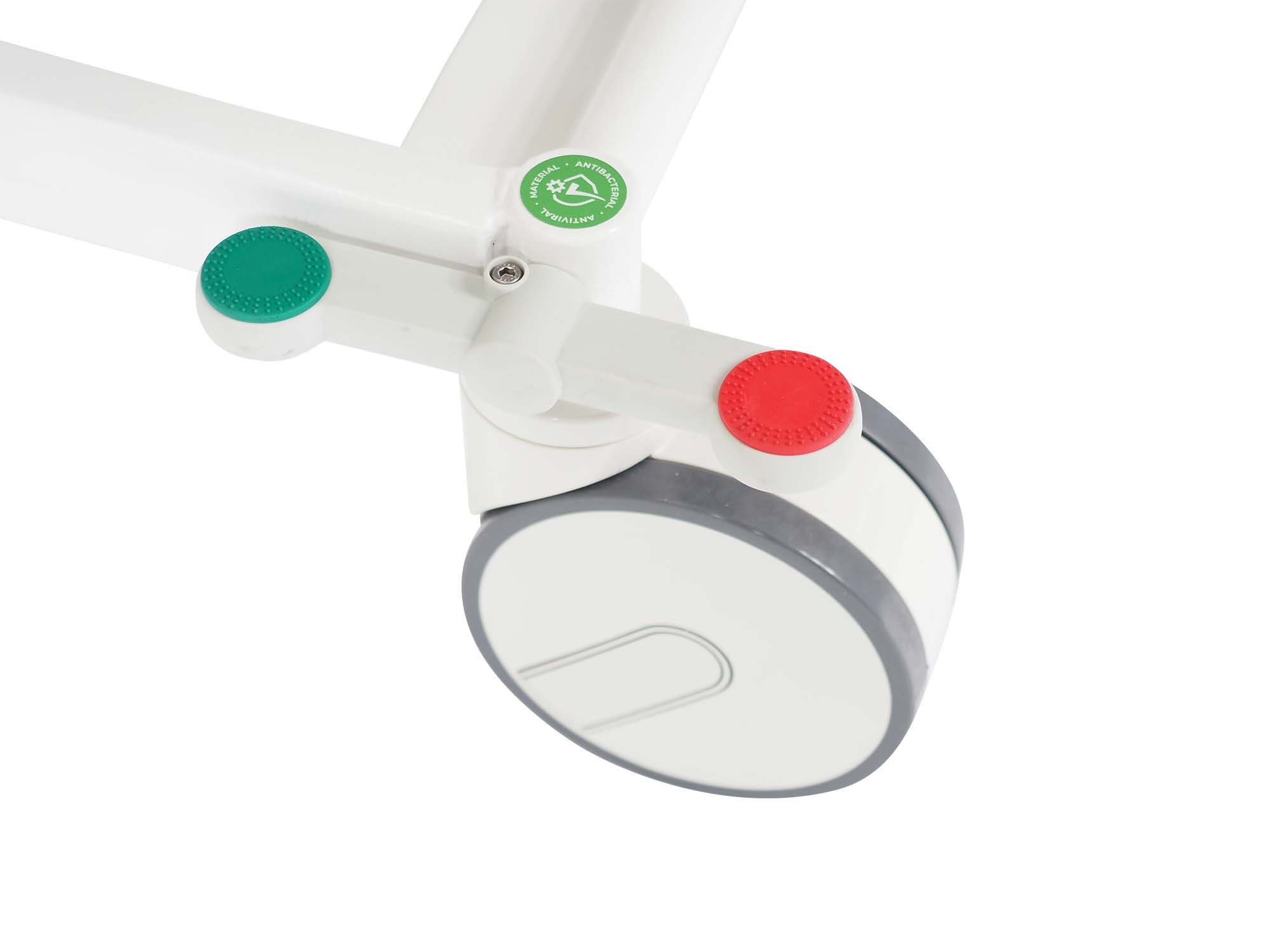 The swivel castors have a unique pedal built in allowing both wheels on each end to be braked when the pedal is engaged on one side only.