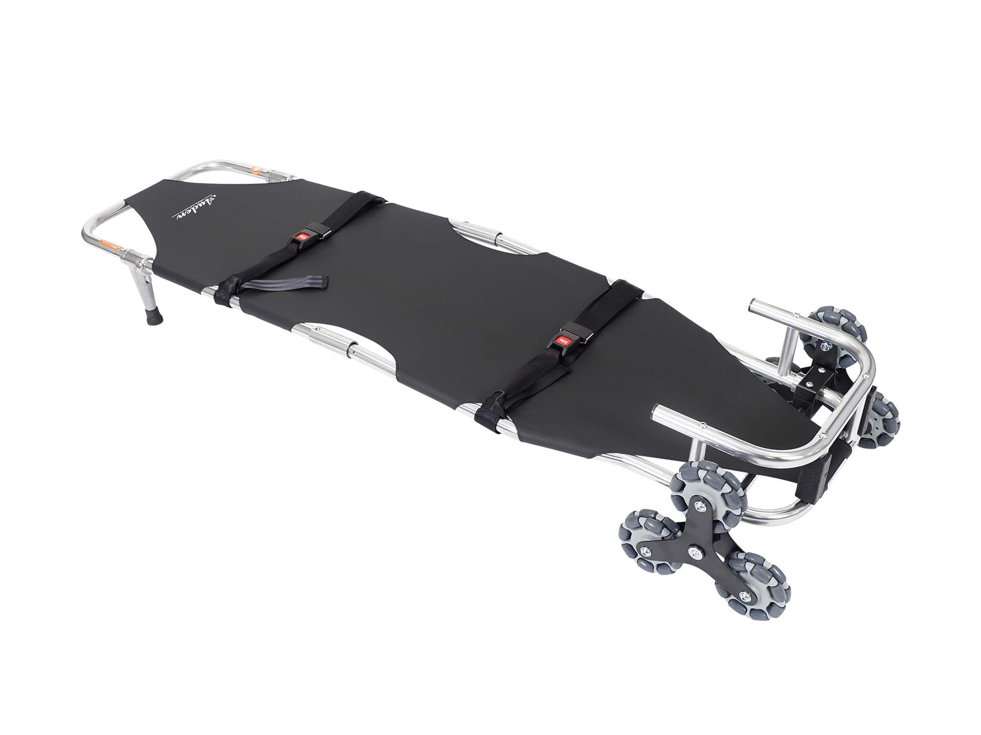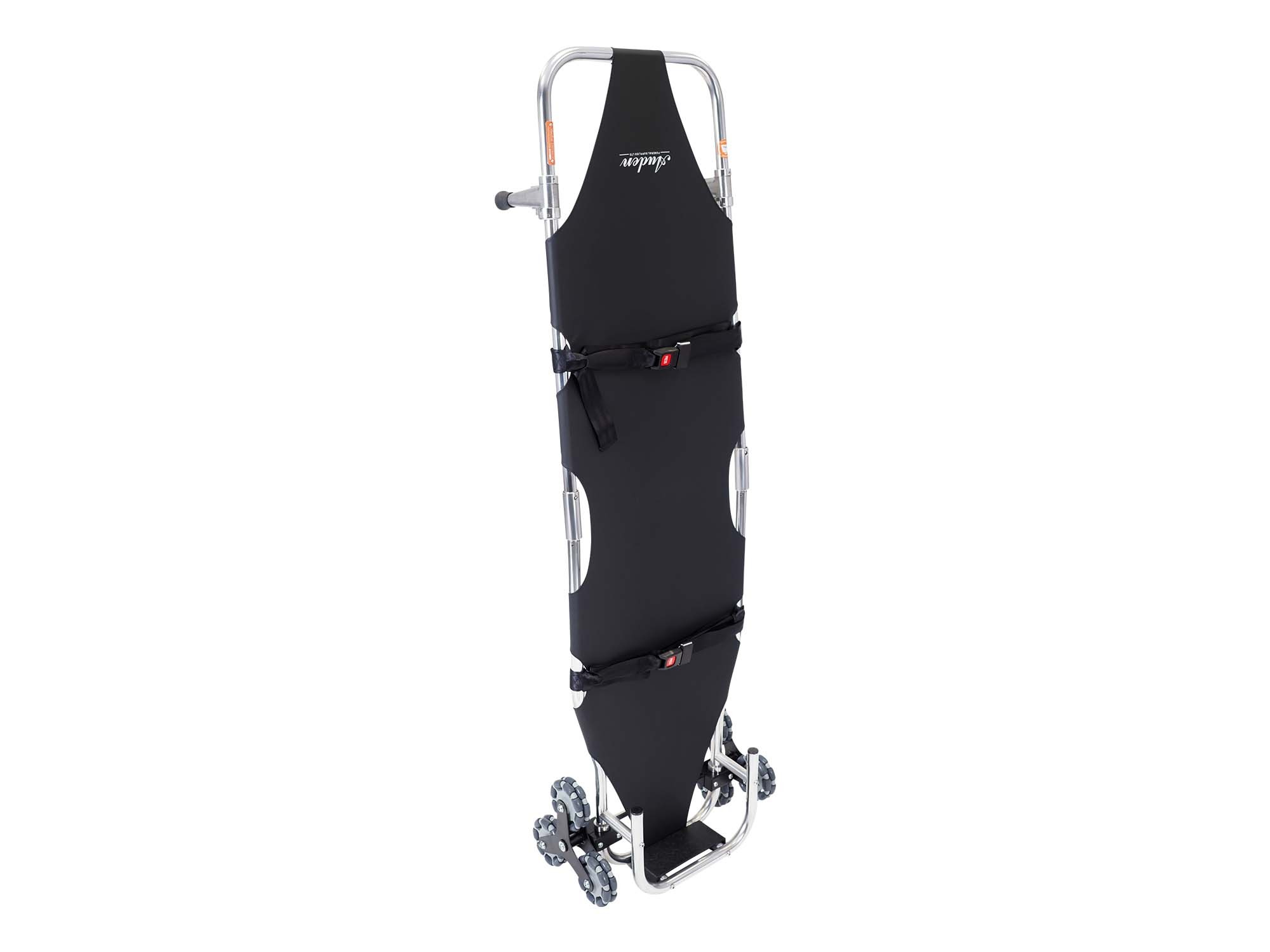 The Contour Stair Stretcher MD is a lightweight funeral stretcher but robust enough for most removals and benefits from having a contoured foot end to aid manoeuvrability in tight spaces. The clever tri-wheel assembly has been neatly brought into the frame width allowing controlled descent of almost any stairs at any angle.