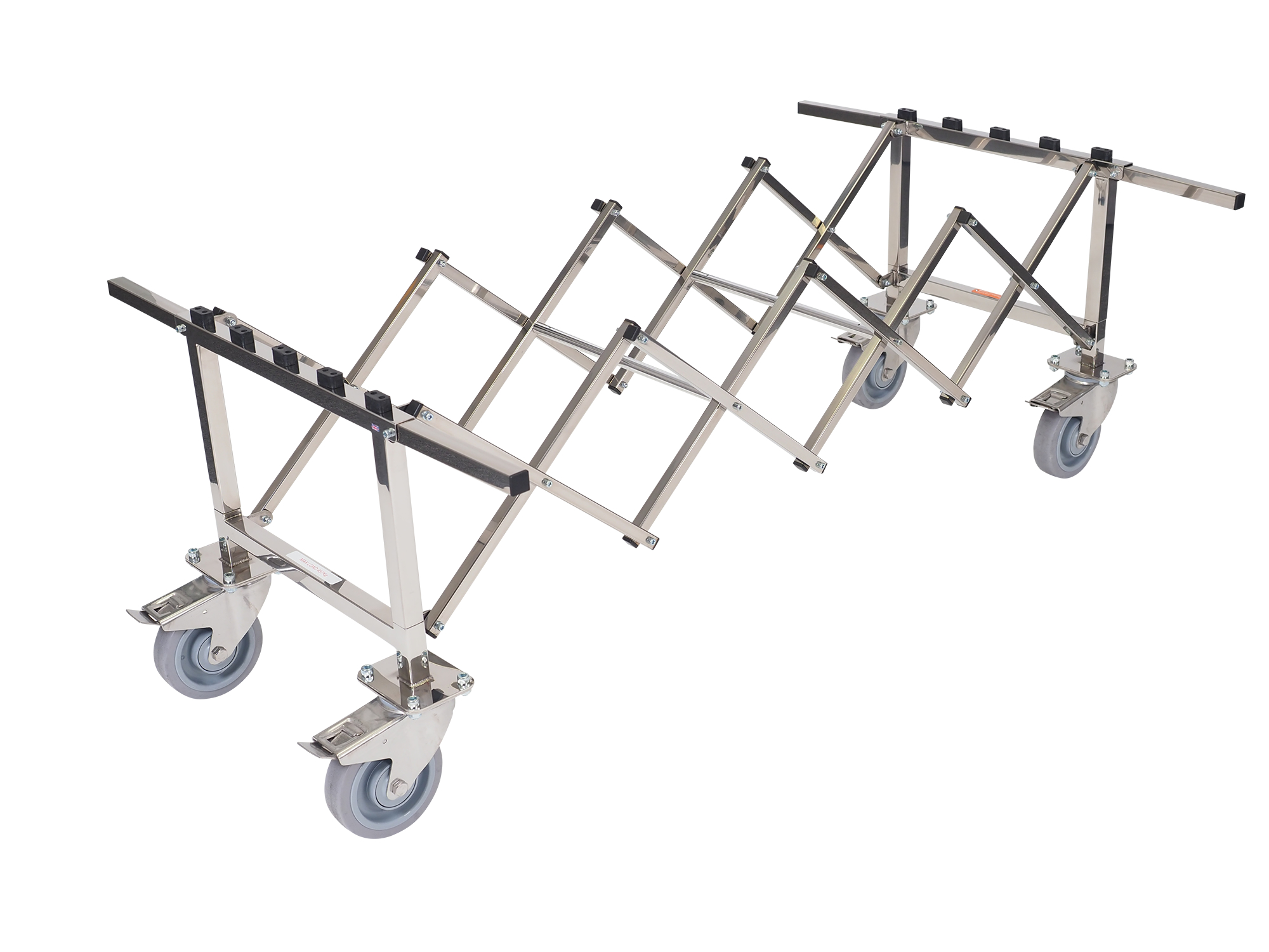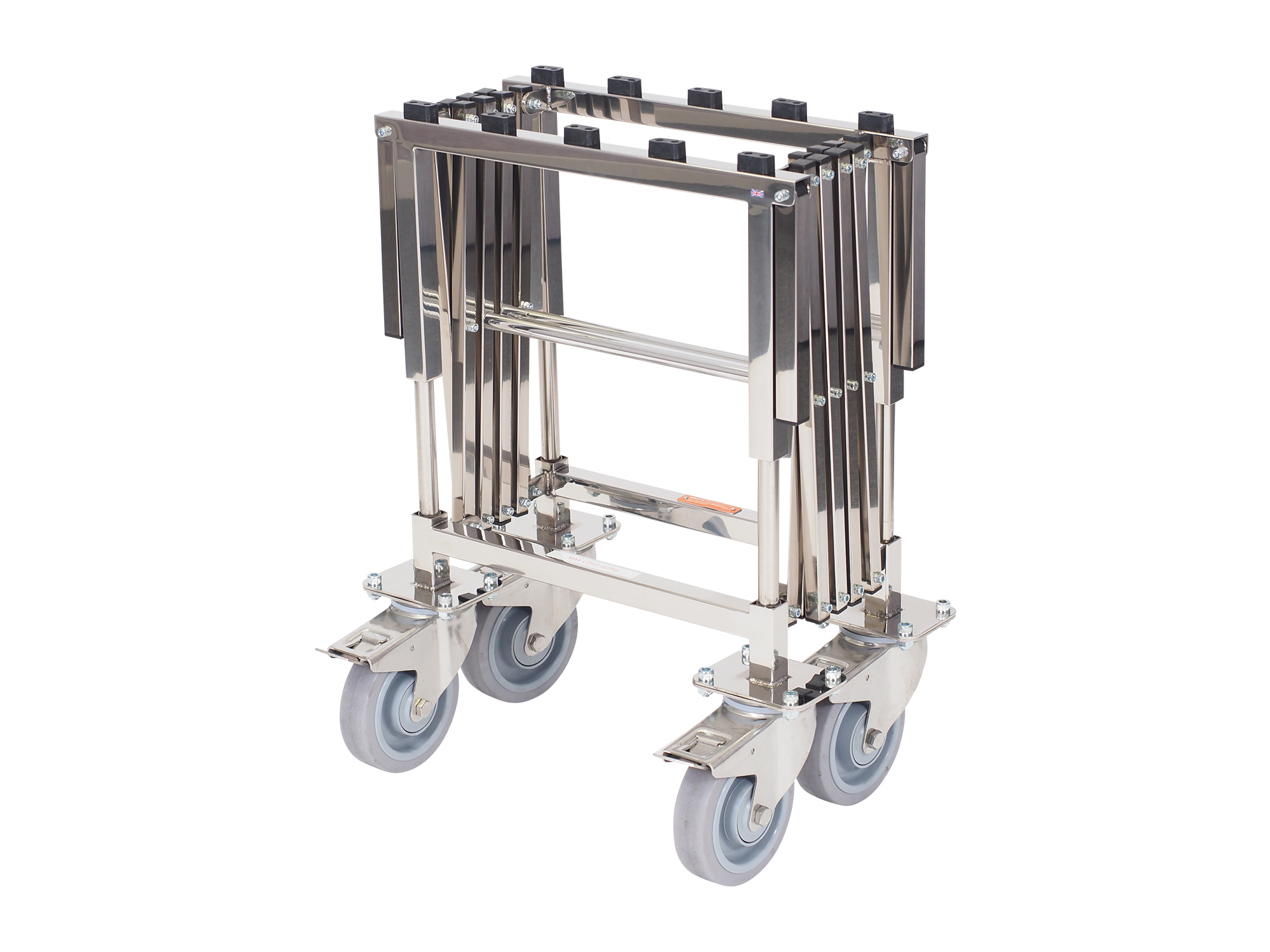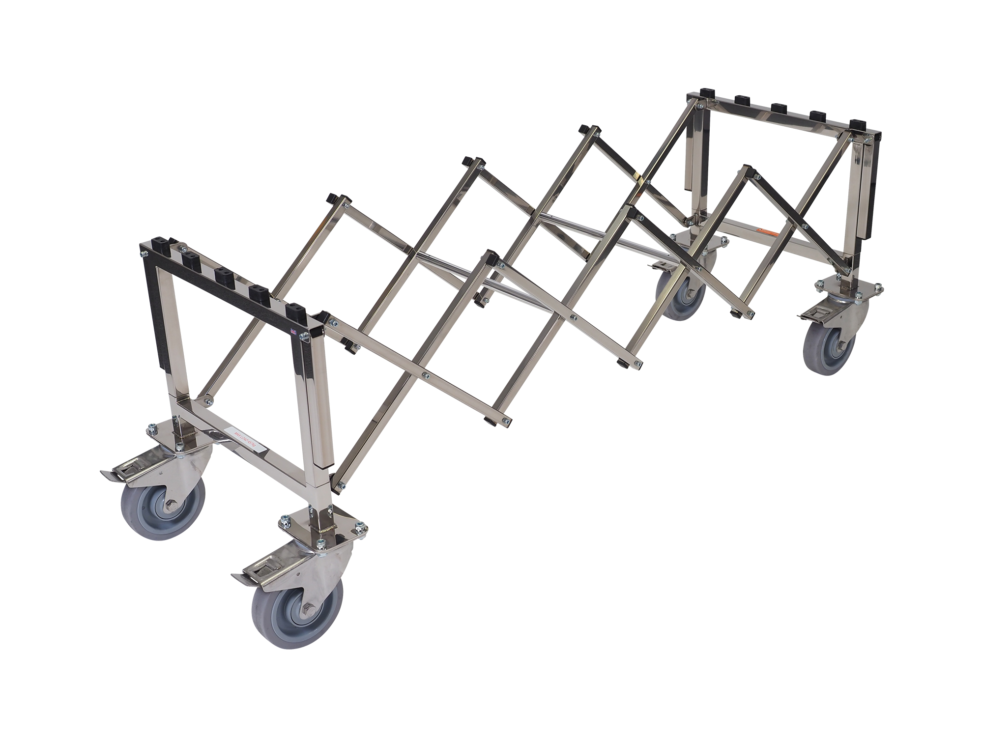 A coffin trolley designed for use where size is important. This specially constructed bier will support 72 stone in weight with its reinforced, concertina steel frame and heavy-duty wheels, it can cope with the largest of coffins and caskets smoothly and safely. Four 9″ folding carry handles help overcome steps.