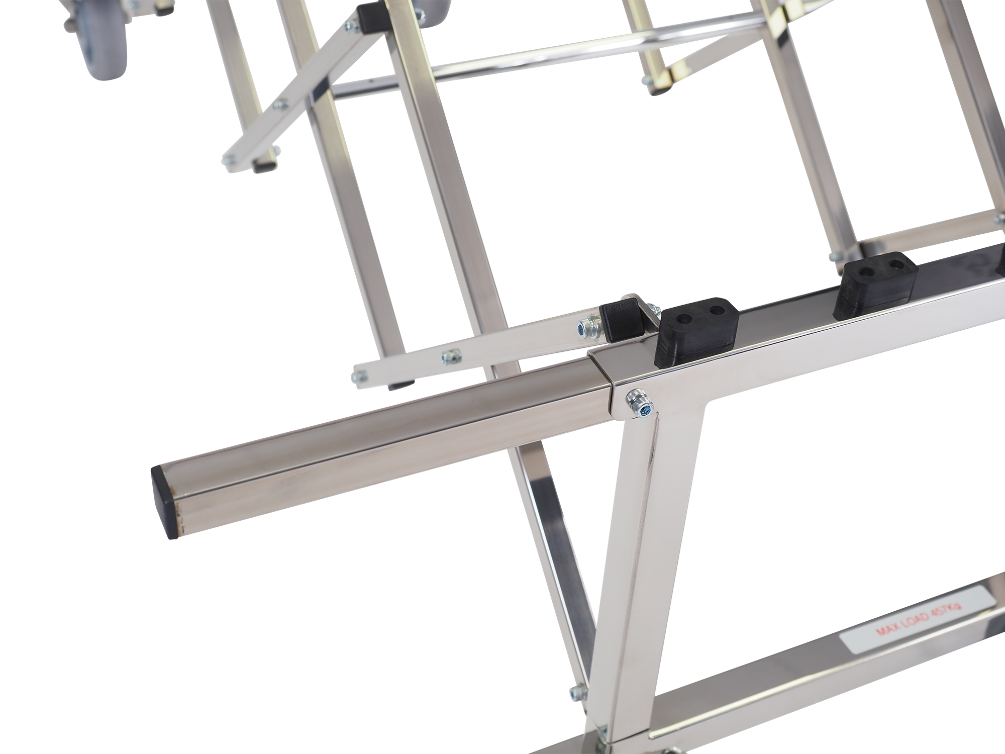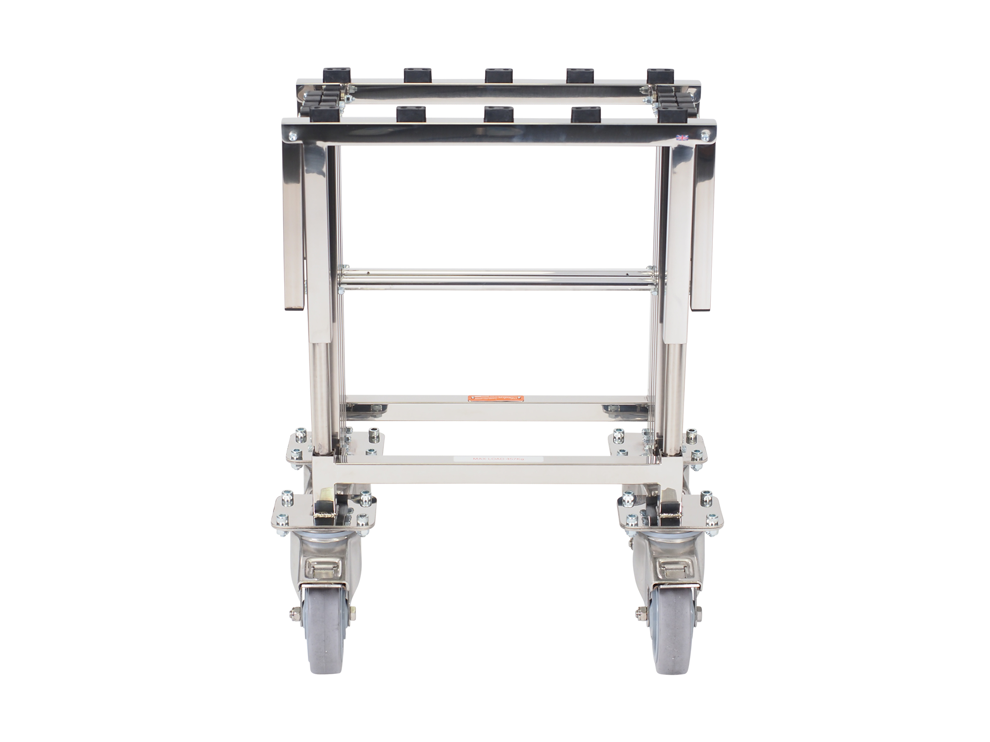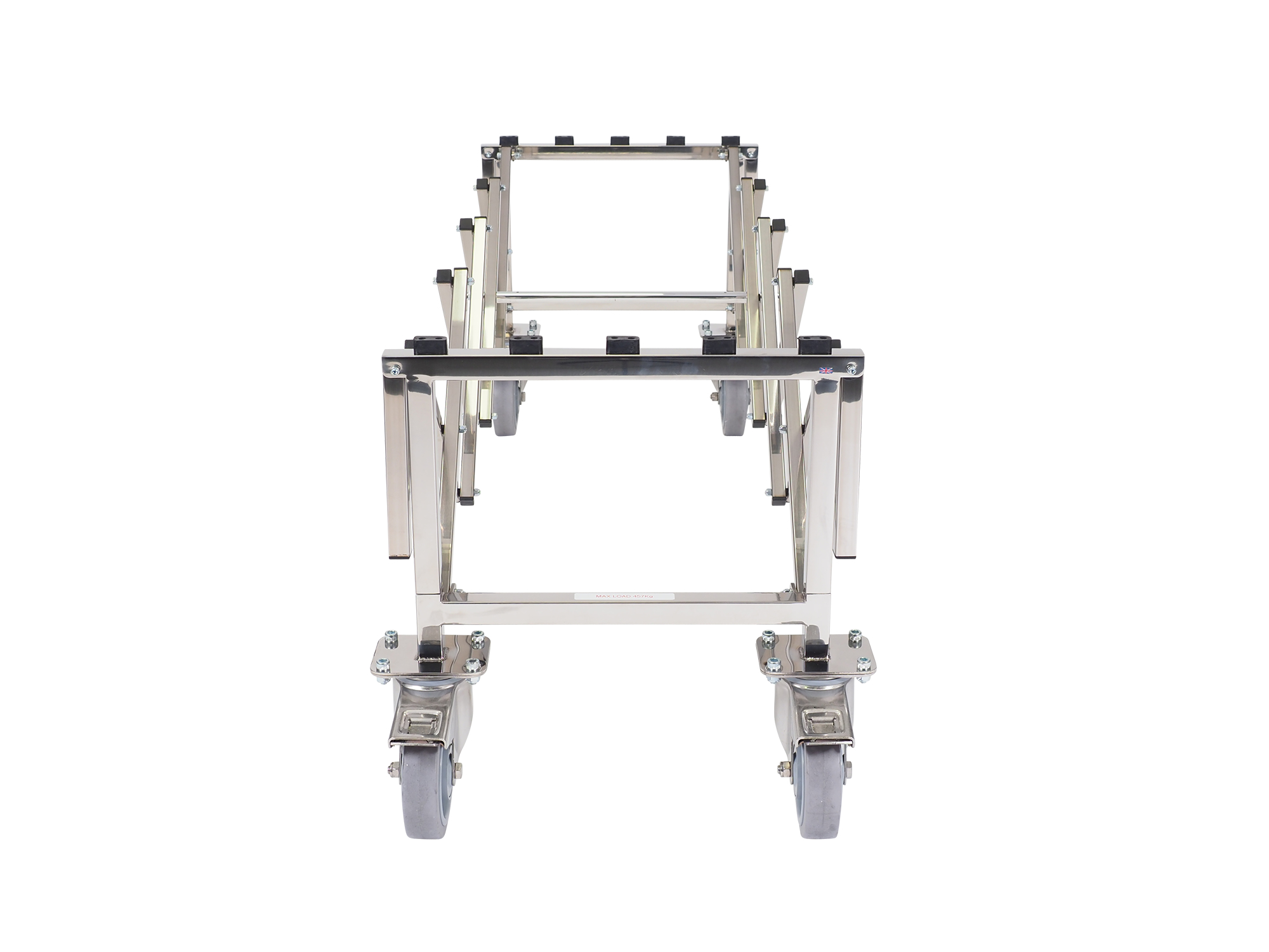 A coffin trolley designed for use where size is important. This specially constructed bier will support 72 stone in weight with its reinforced, concertina steel frame and heavy-duty wheels, it can cope with the largest of coffins and caskets smoothly and safely. Four 9″ folding carry handles help overcome steps.