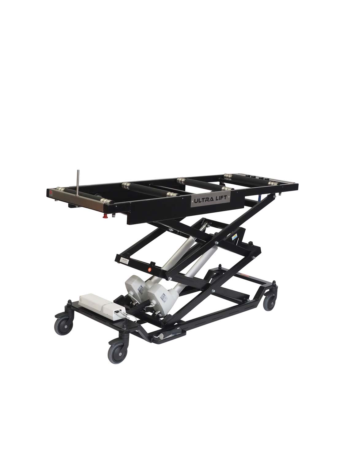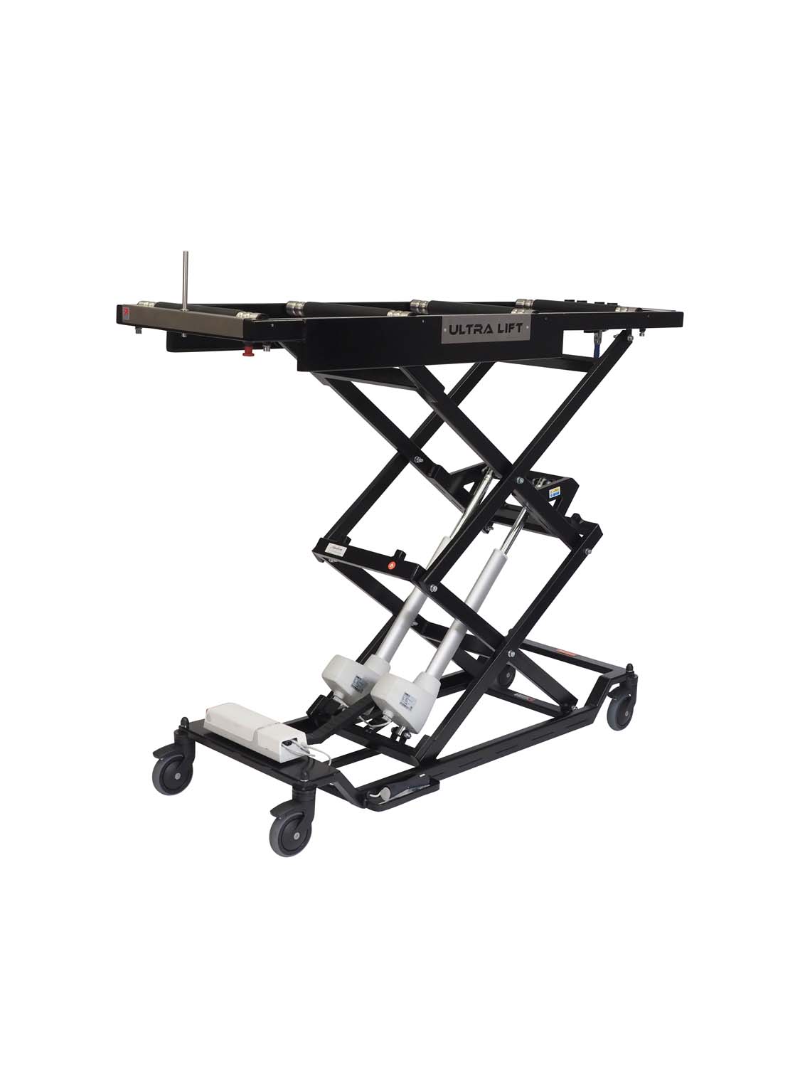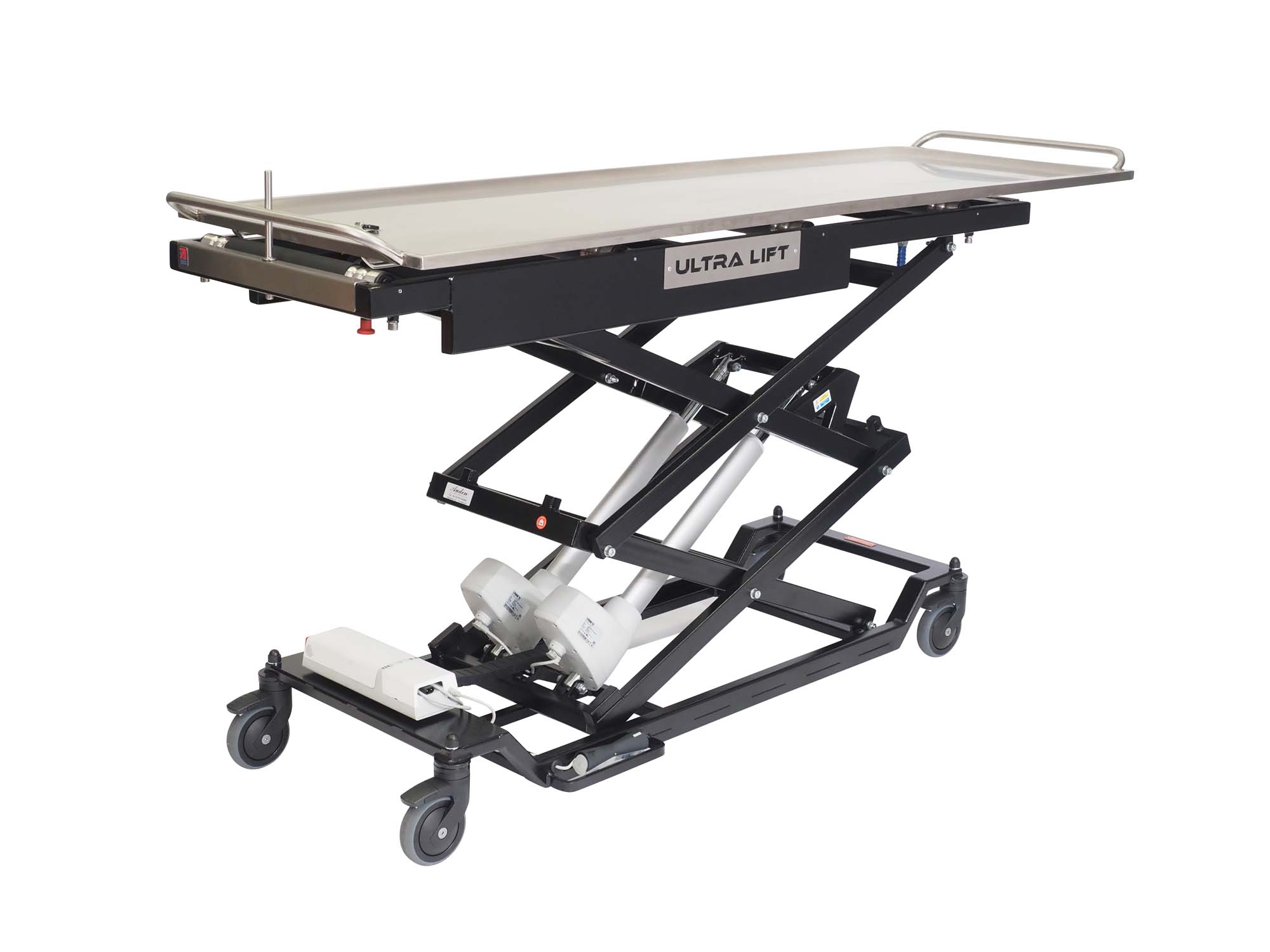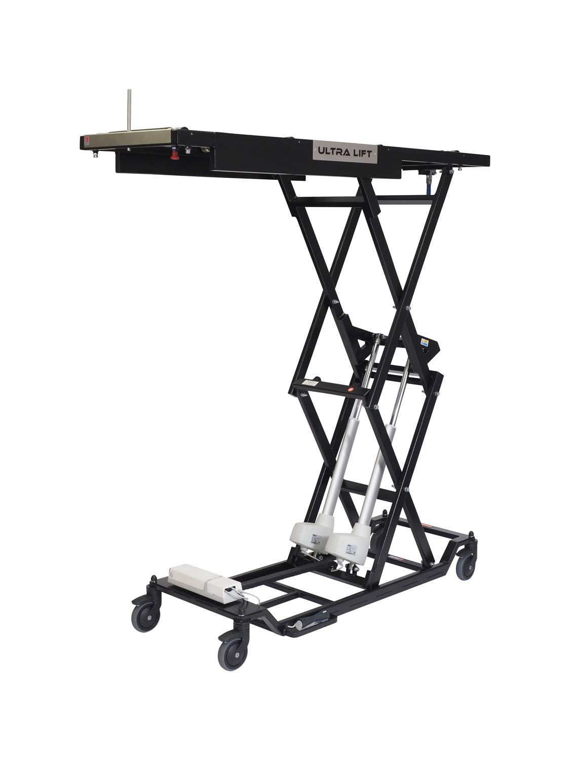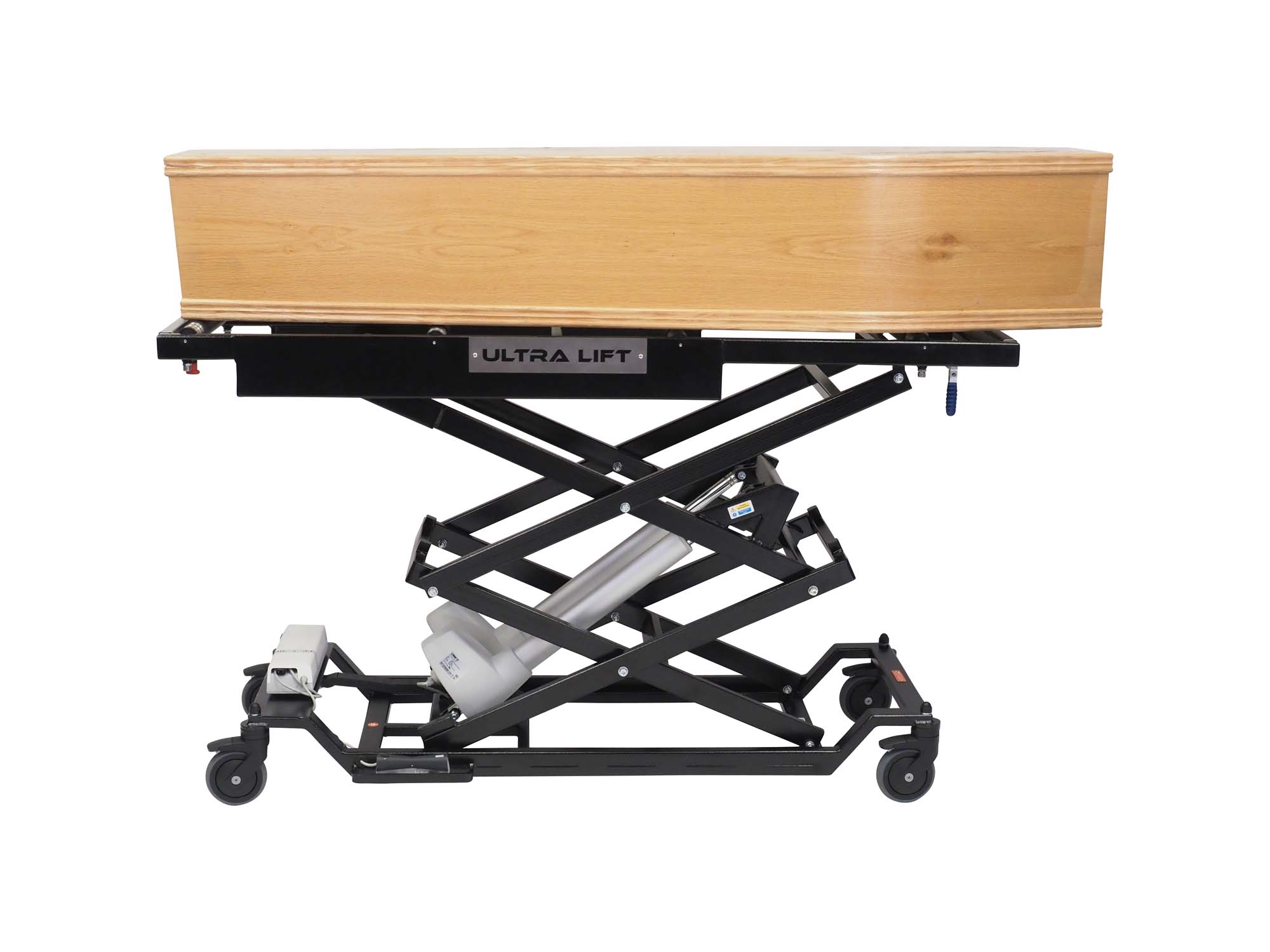 The Ultra Lift is battery powered and mains chargeable and is controlled from a mounted foot controller. The product can reach a 3 tier mortuary fridge and is available with a standard length top or a longer top.