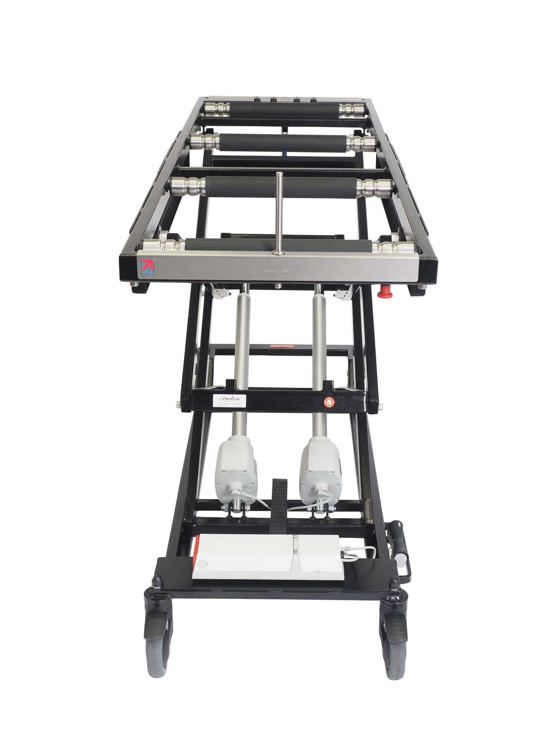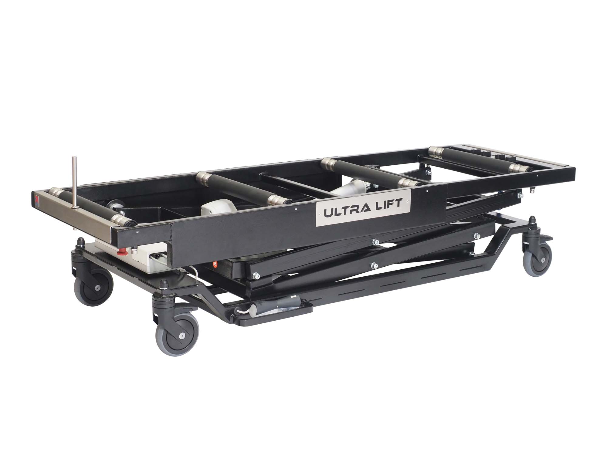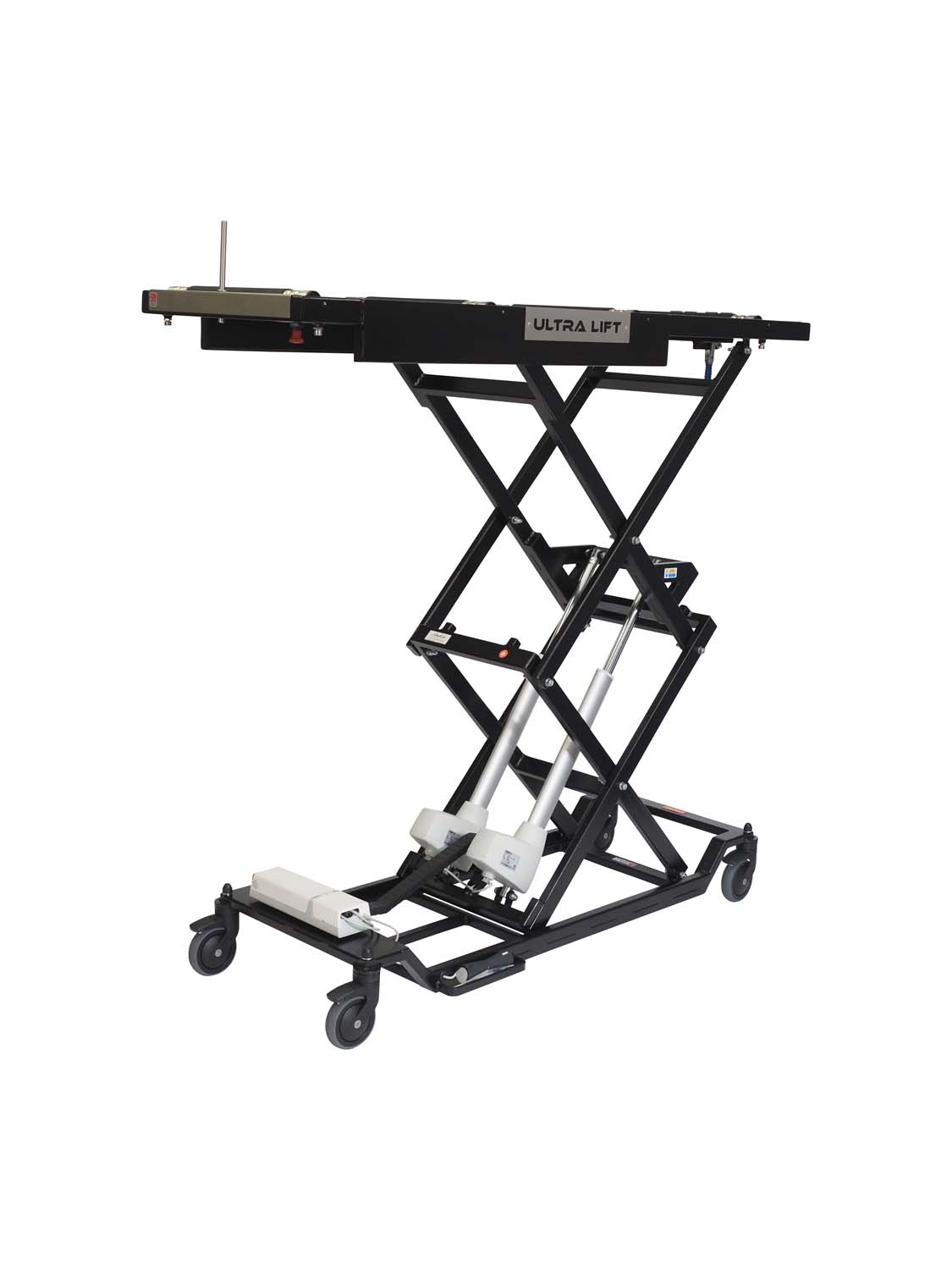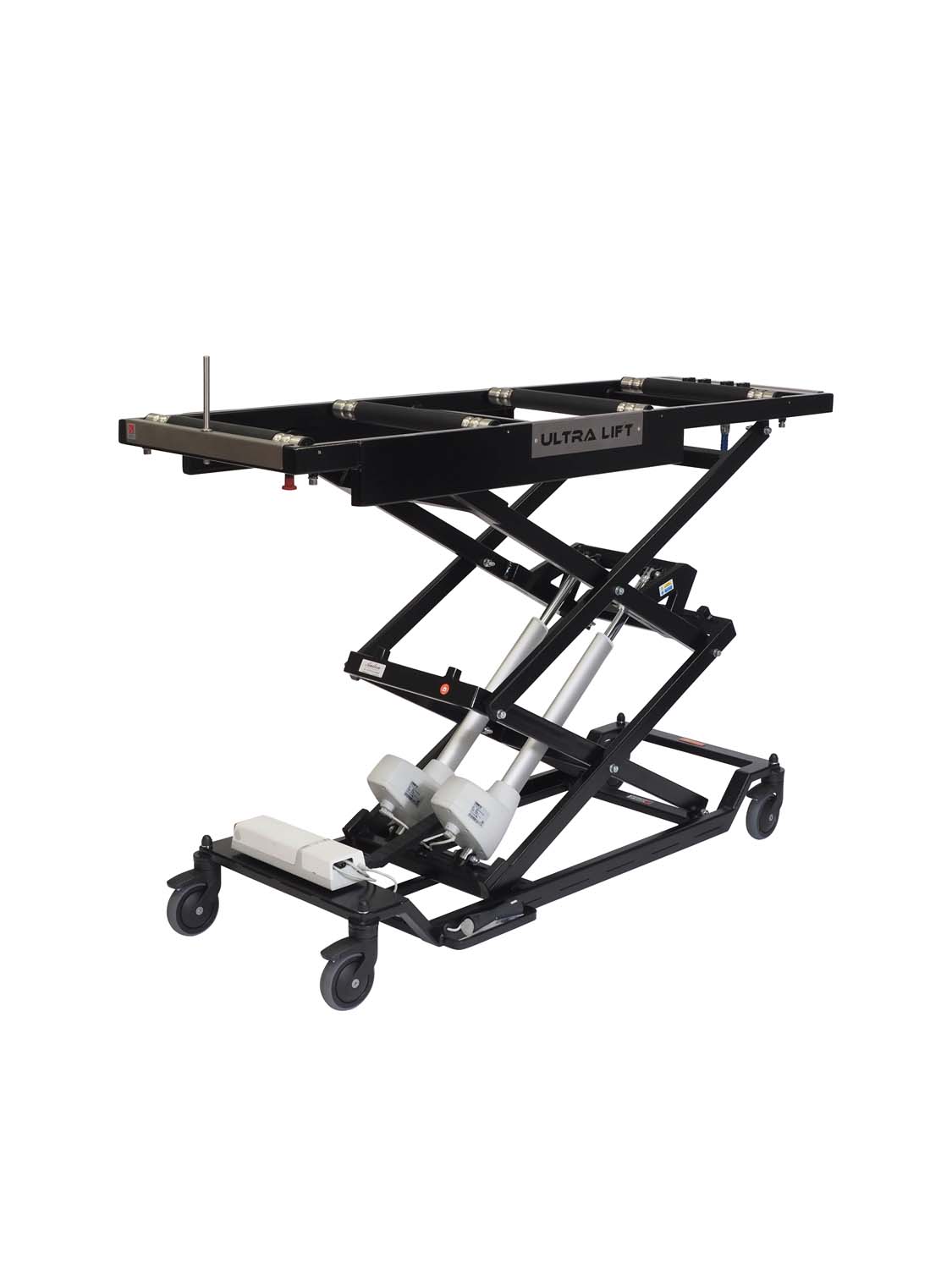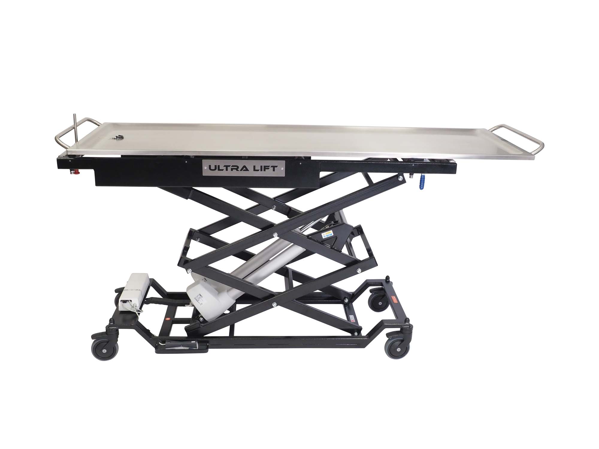 The Ultra Lift is battery powered and mains chargeable and is controlled from a mounted foot controller. The product can reach a 3 tier mortuary fridge and is available with a standard length top or a longer top.